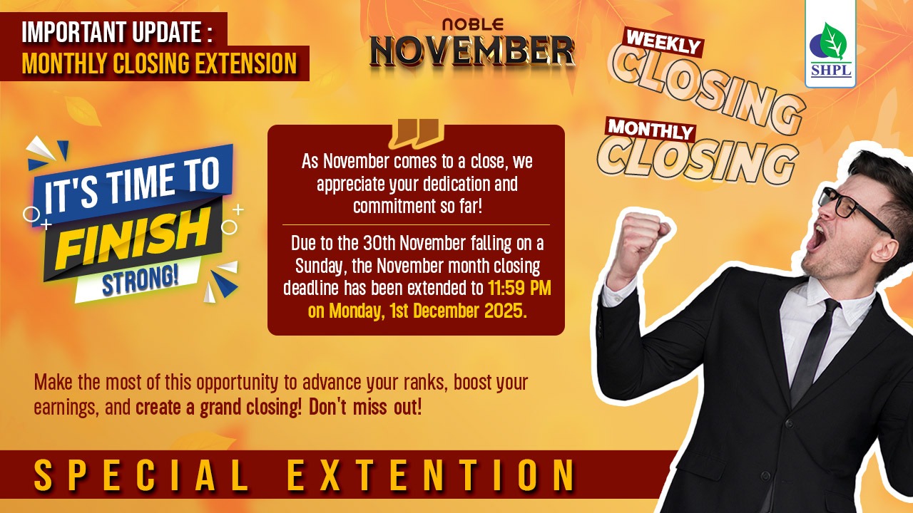 IMPORTANT UPDATE: November Month Closing Extension! As November comes to a close, we appreciate your dedication and commitment so far! Due to the 30th November falling on a Sunday, the November month closing deadline has been extended to 11:59 PM on Monday, 1st December 2025. Make the most of this opportunity to advance your ranks, boost your earnings, and create a grand closing! Don't miss out!