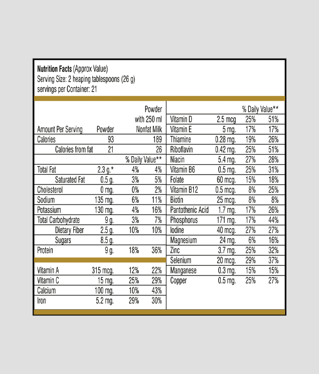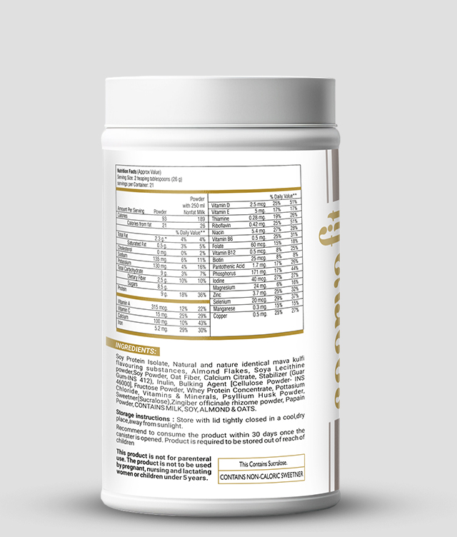 Soy Protein Isolate, Natural & nature identical mava kulfi flavouring, Almond flakes, Soya Lecithine Powder, Soy Powder, Oat Fiber, Calcium Citrate, Fructose Powder, Whey Protein Concentrate, Potassium Chloride, Vitamins, Minerals, Zingiber Officinale Rhizome Powder, Papain Powder
