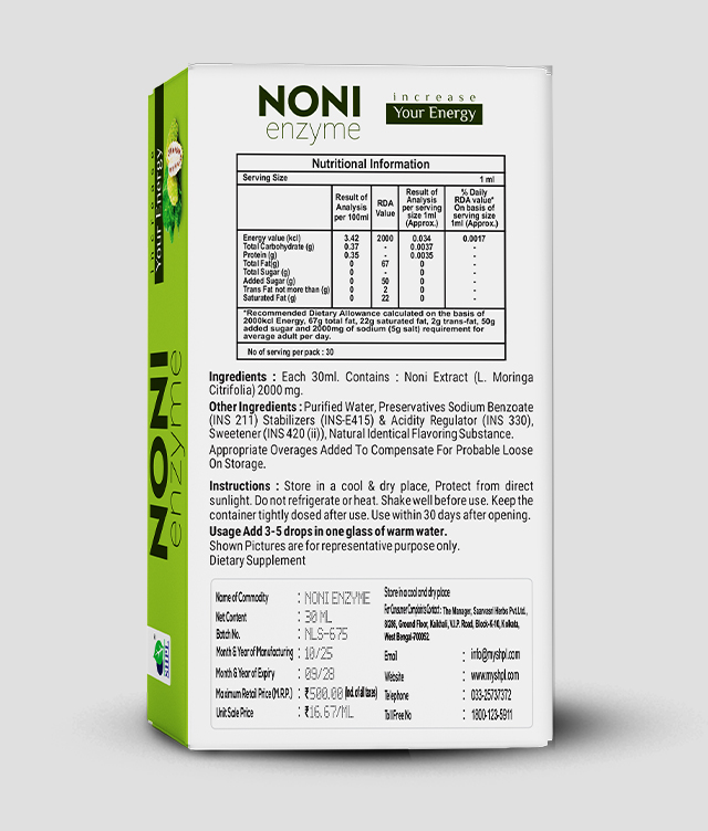 The noni fruit or Morinda Citrifolia has been used since ancient times for its medicinal properties which boosts the immune system and helps in detoxification. Noni fruit is rich in antioxidants, Vitamin C, Vitamin B3, Vitamin A and Iron. Noni juice is said to be a magical drink as it affects so many bodily systems positively. Saarvasri Noni Enzyme is made of pure Noni Extract. The extract is in a highly concentrated form so that a very small quantity will be sufficient at a time. Noni Enzyme can penetrate the body cells rapidly, help in absorption of nutrients by the cells. It promotes micro-circulation and corrects the metabolism processes in the body, besides strengthening the self-defense ability of the cells.