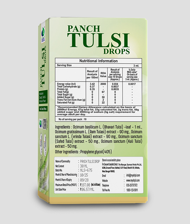 It is well known in the epics that Tulsi is known for its medicinal values. Tulsi is worshipped in Hindu religion/ rituals. It is a religious practice to water mother Tulsi. Apart from rituals and religion, Tulsi itself holds the position to be the Worlds best medicinal plant which has properties like anti – oxidant, anti – aging, anti – viral, anti – bacterial, anti – flu, etc . Saarvasri Herbs Panch Tulsi Drop has a lot of benefits. It has super natural health curing qualities and helpful in all types of Allergies. It has beneficial effect on mind and body. It gives relaxation to mind and body. Scientists have also acknowledged the medicinal properties of Tulsi.