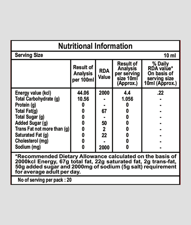 Basana (Adhatodavasica), Jeera (Cuminumcyminum), Saunf (Foenicelumvulgare), Soya (Anethusowa), Ashwagandha (Withaniasomnifera), Khubkalan (Sisymbriumirio), Anantmool (Hemdesmusindicus), Manjishtha (Rubiacordifolia), Elaichi (Ellectariacardamomum), Brahmi (Bacopamonorriery), Datstraw (Avenasativa), Navasar, Satava Nimbo (Citrusmedica), Lohasav (R.T.S.), Limewater.