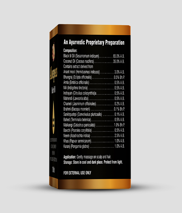 Black Till oil, Bhringraj, Coconut Oil, Neem, Anantamul, Amla, Bahera, Bramhmi, Karan, Malkangi, Mehendi, Sankhpushpi.