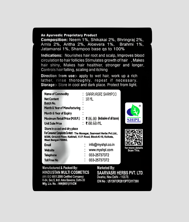 Saarvasri shampoo is formulated with lots of natural ingredients which specially used for damaged hair and hair fall problem. It's premium quality's ingredients and antioxidant property nourishes scalp and hair, unclog follicle, remove impurities & Make hair stronger root to tips.