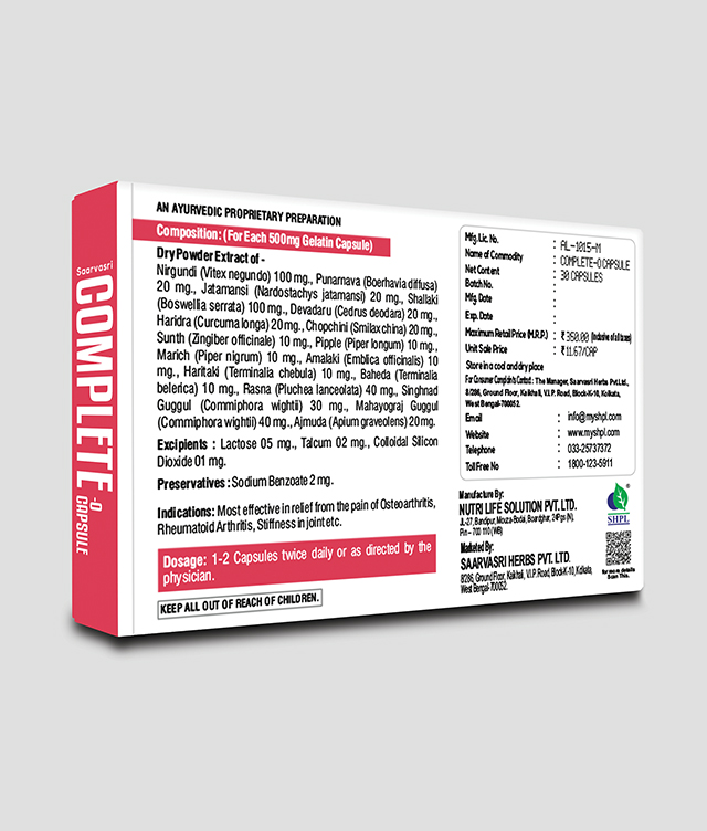 Saarvasri Herbs Complete-O Capsule is a wonderful product for relieving pain & inflammation. It is enriched with many important natural herbs to control Arthritis, Osteo-arthritis, Muscle and Joint Pain. It is the best and complete solution for your pain.