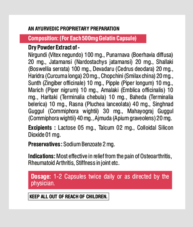Nirgudi Ext, Punarnava Ext, Jatamansi Ext, Shallaki Ext, devdaru, Haridra, Chopchini, Trikatu, Triphala, Maharasnadi, Sihnadi Guggul, Mahayograj Guggul, Vishtundaka Vati, Sameer Pannag Ras, Ajmodadi Churna, Sanjeevani Vati.