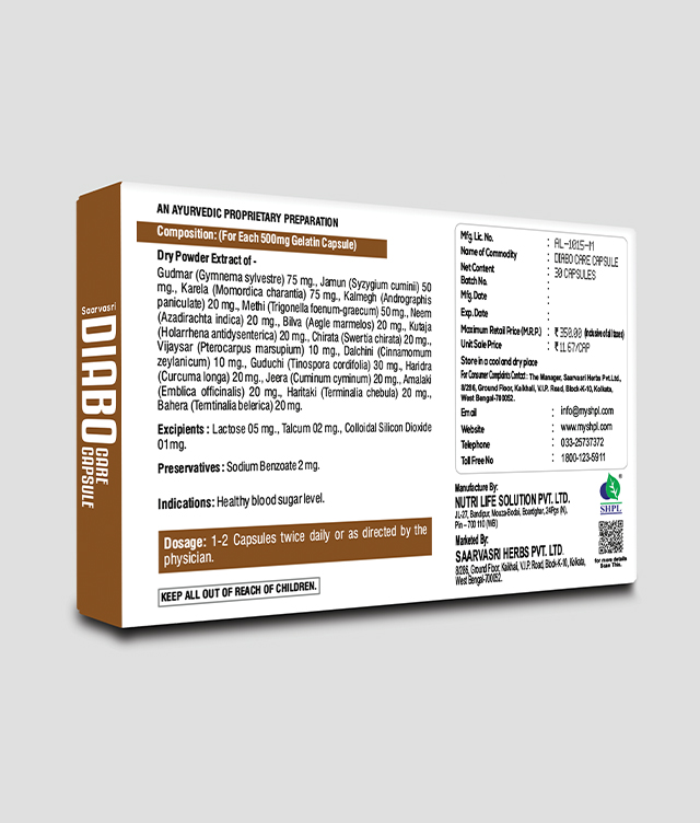 Saarvasri Herbs introduces Diabo Care Capsule, a wonderful product for diabetic patients. Diabo Care Capsule is very helpful for lowering blood sugar level, increasing the secretion of Insulin and activating the beta cells.
