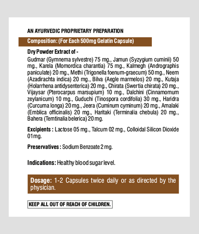 Gudmar, Jamun, Karela, Kalmegh, Methi, Neem, Mamejava, Bilva, Kutaj, Chiraita, Vijaysar, Dalchini, Guduchi, Sarponkha, Haridra, Jeera, Triphala, Chandraprabha Vati, Yashad Bhasma.