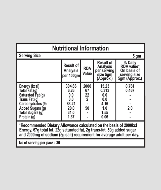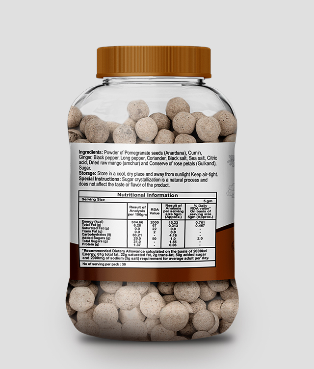 Pomegranate seeds (Anardana), Cumin, Ginger, Black pepper, Long pepper, Coriander, Black salt, Sea salt, Citric acid, Dried raw mango (amchur) and Gulkand.