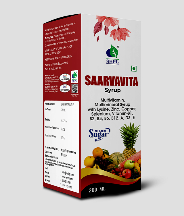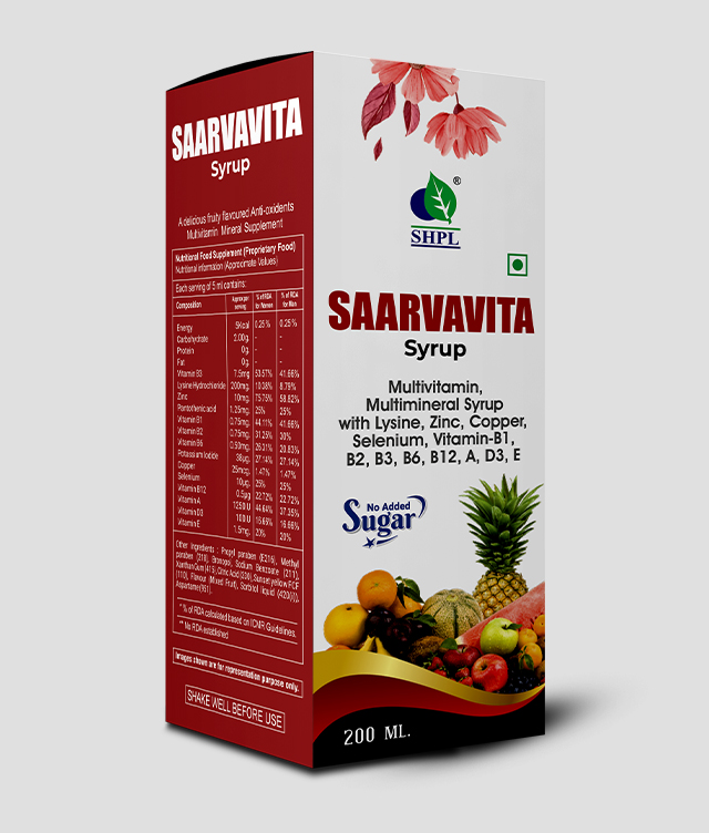 Introducing SHPL Saarva Vita Syrup, a comprehensive antioxidant, multivitamin, and multimineral formula designed to nourish your body from within. Packed with a powerhouse blend of essential vitamins and minerals, including Vitamin A, B1, B2, B3, B5, B6, B12, D, E, Copper, Zinc, Selenium, Lysine Hydrochloride, and Potassium Iodide, this syrup offers a multitude of health benefits.
