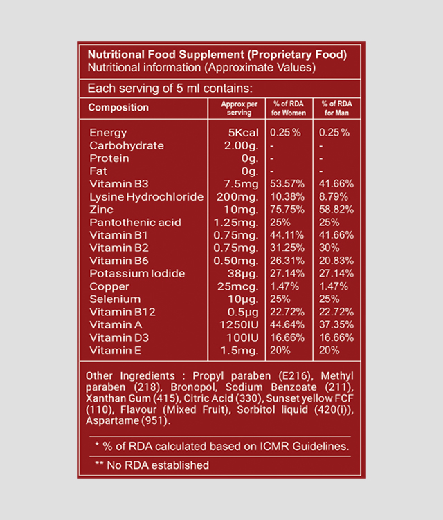 Vitamin A, B1, B2, B3, B5, B6, B12, D, E, Copper, Zinc, Selenium, Lysine Hydrochloride, and Potassium Iodide, Flavoured Syrup Base.