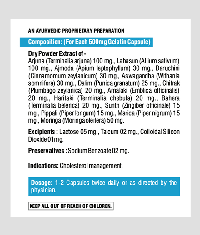 Arjun, Lahsun, Ajmoda, Dalchini, Ashwagandha, Dadim, Chitrak, Trikatu, Triphala, Prabhakar Vati, Moti Pishti, Shewaga.