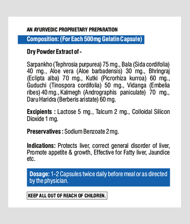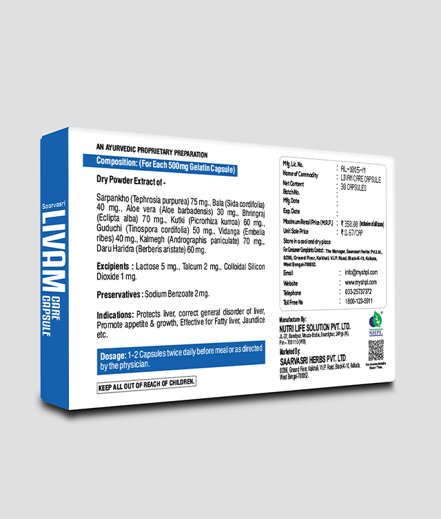 Livam Care Capsules contains different vital herbs in optimum concentration required to provide complete benefits to restore liver function parameters, which may help to check degeneration and promote regeneration of liver cells. Livam Care may have antiviral, antioxidant, anti-inflammatory and immune- modulator action.
