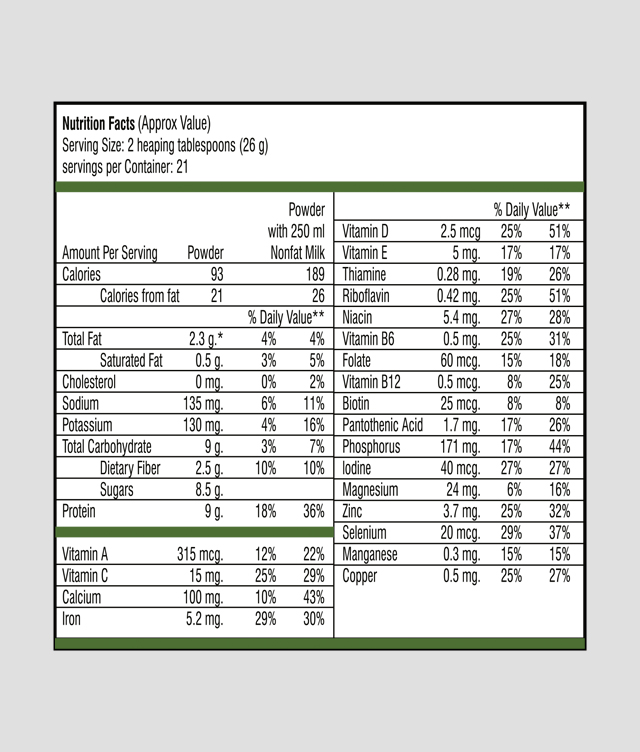 Soy Protein Isolate, Natural & nature identical Mango flavouring, Almond flakes, Soya Lecithine Powder, Soy Powder, Oat Fiber, Calcium Citrate, Fructose Powder, Whey Protein Concentrate, Potassium Chloride, Vitamins, Minerals, Zingiber Officinale Rhizome Powder, Papain Powder