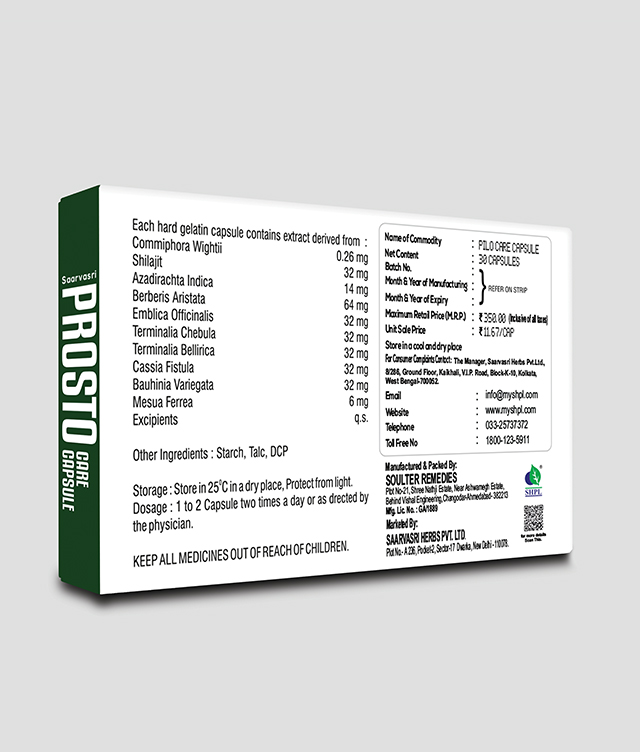 Saarvasri Herbs Prosto Care capsule is a perfect blend of many natural herbs to control any problem regarding our prostate and urination without any side effect. Prosto Care supports healthy prostate and normal male urogenital function. It improves urinary tract function and flow, reduces symptoms of enlarged prostate, supports healthy PSA levels and restores male energy.