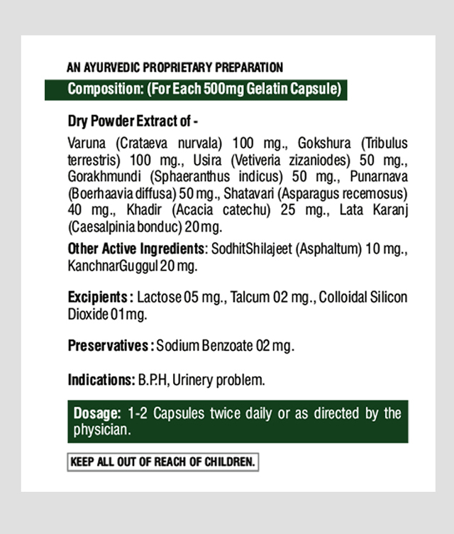 Varuna, Gokhru, Khus Khus, Gorakhmundi, Punarnava, Shatavari,Khadir, Salam Mishri, Lata Karanj, Shilajit, Kanchnar Guggul