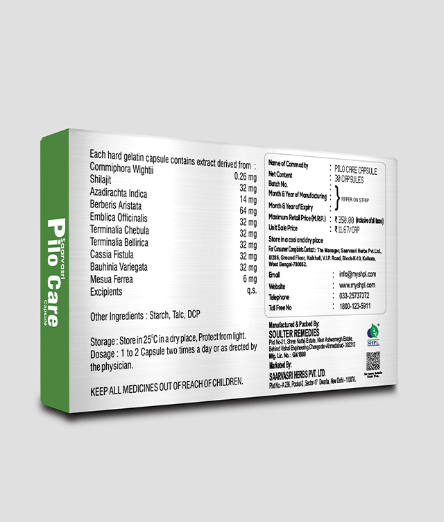 Relieve piles and fissures with Saarvasri Pilo Care Capsules. This herbal formulation reduces inflammation, promotes healing, and provides relief from discomfort. Experience comfort with Pilo Care Capsules.