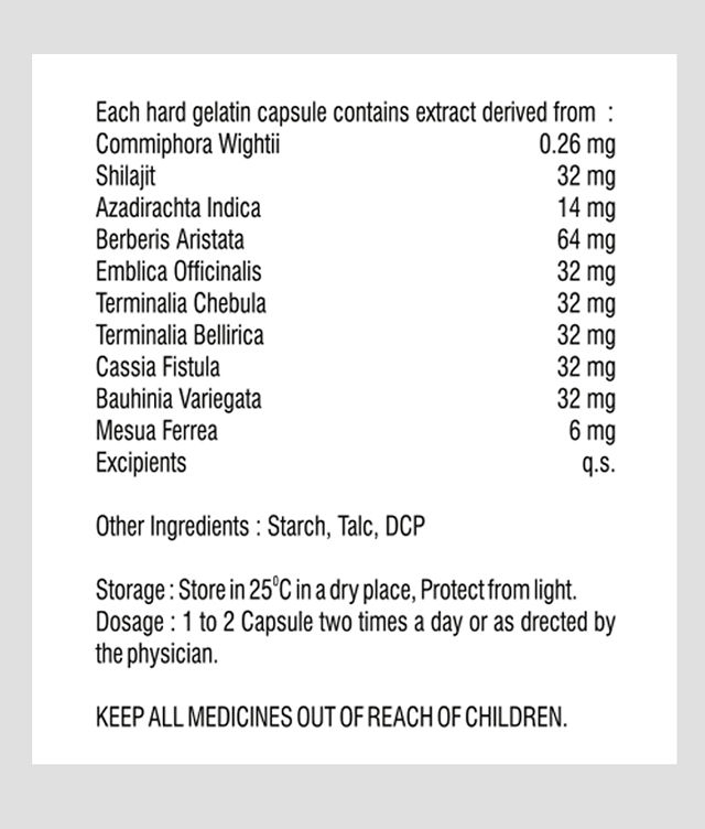 Commiphora Wighiti, Shilajit, Azadirachta Indica, Berberis Aristata, Emblica Officinalis, Terminalia Chebula, Terminalia Bellirica, Cassia Fistula, Bauhinia Variegata, Mesua Ferrea.