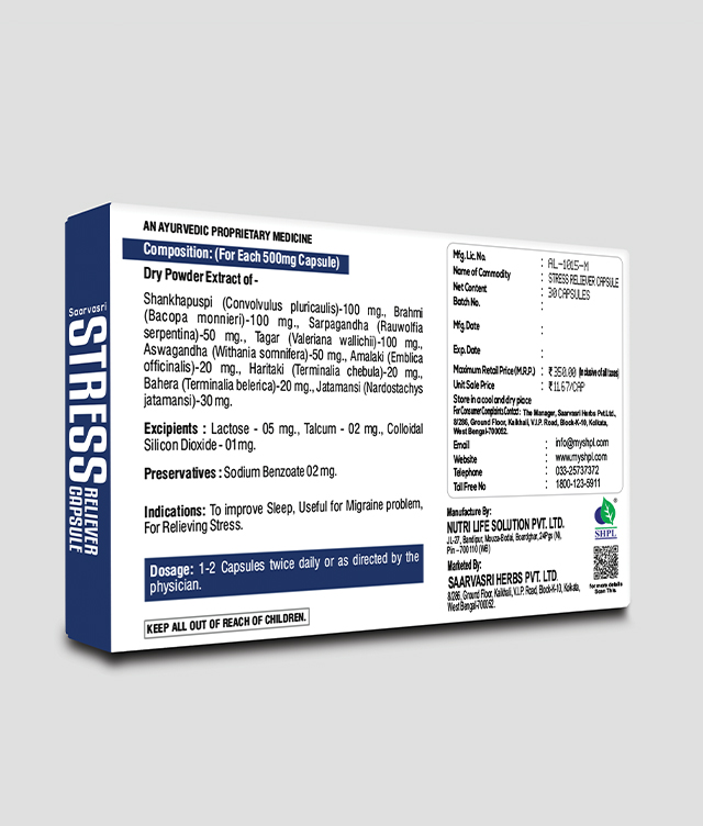 Relieve stress and enhance sleep with Saarvasri Stress Reliever Capsules. This herbal formulation calms the mind, reduces anxiety, and promotes restful sleep. Experience tranquility with Stress Reliever Capsules.