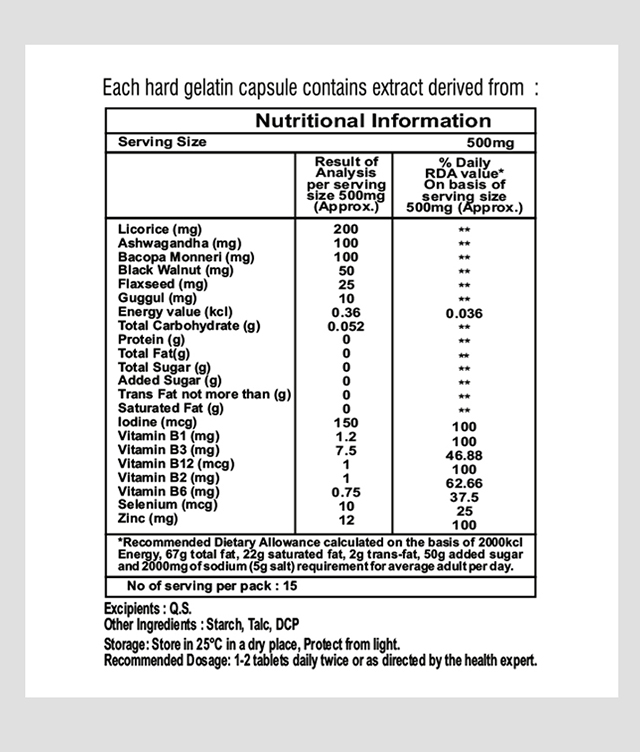 Licorice, Ashwagandha, Bacopa Monneri, Black Walnut, Flax Seed, Guggul