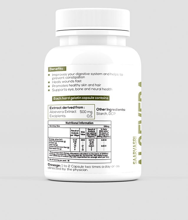 Saarvasri Herbs Aloevera Capsule is a wonderful product. Aloevera, “the plant of immortality”, has its own medicinal value from centuries. Aloe Vera contains many vitamins including A, C, E, folic acid, B1, B2, B3 (niacin), B6. Aloe Vera is also one of the few plants that contain vitamin B12. Minerals found in Aloevera include: calcium, magnesium, zinc, chromium, selenium, sodium, iron, potassium, copper, manganese.