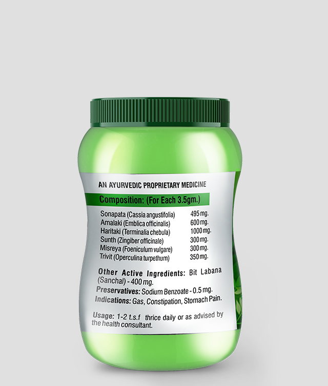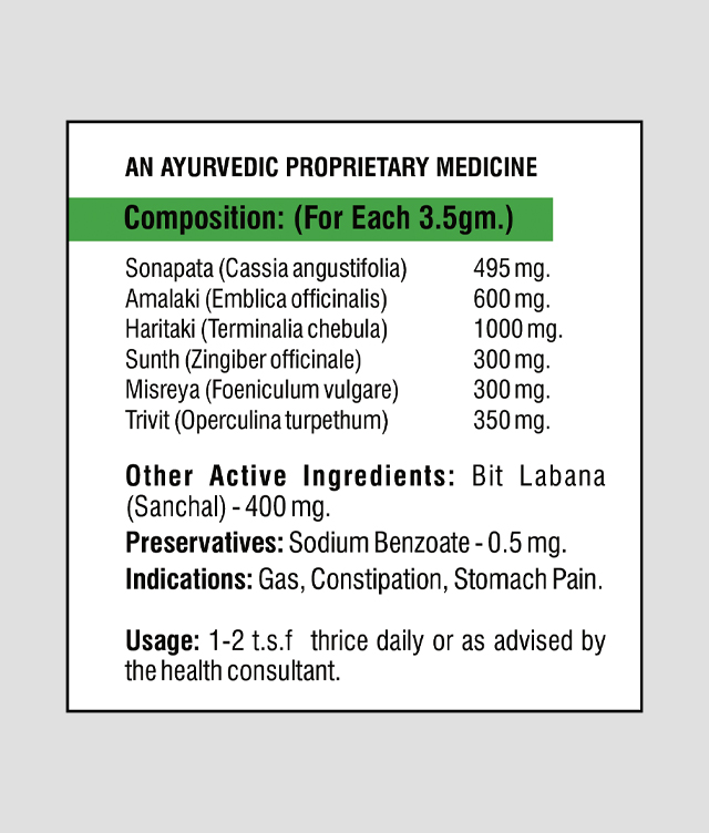 It is an effective remedy in Ayurvedic world for treating acute and chronic constipation, acidity, stomach pain and allied problems. Treats stomach ache, head ache, burning sensation in stomach related to constipation.