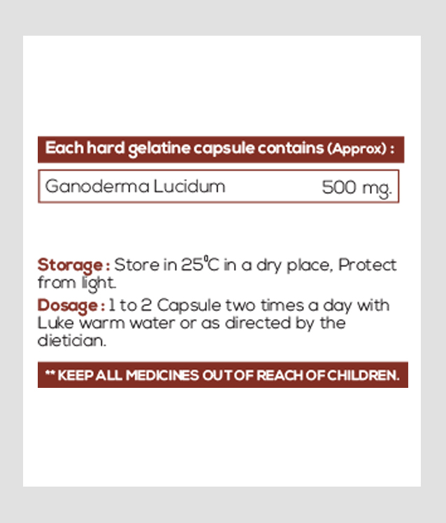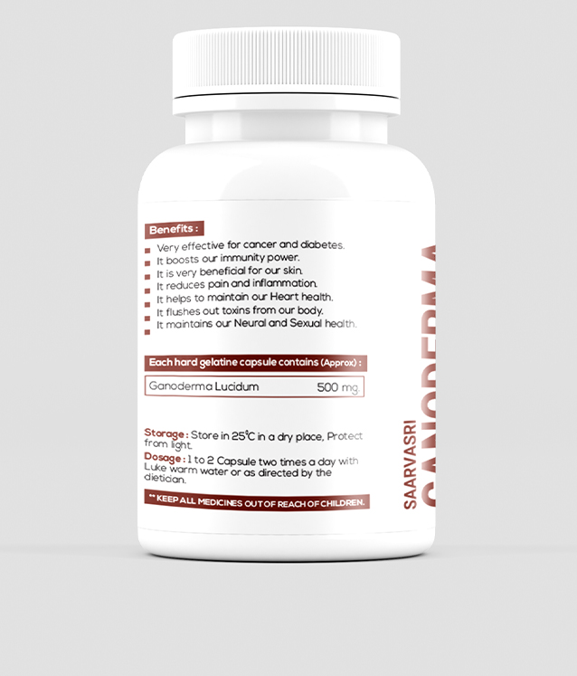 Saarvasri Herbs Ganoderma Capsule is made from Ganoderma Lucidum, commonly known as Reishi Mushroom, is frequently used in traditional Chinese medicines. There are over 36 bio-active nutritional compounds present in Ganoderma. It is rich in essential amino acids, beta-glucans, antioxidants, enzymes, minerals and vitamins.