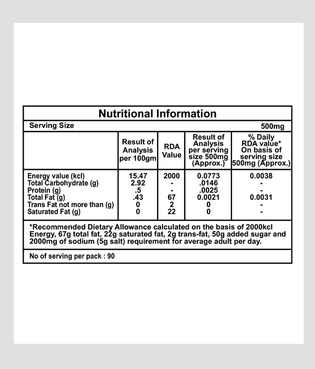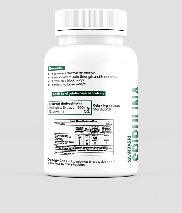 Spirulina is a blue-green microalgae that has been consumed for centuries due to its high nutritional value and supposed health benefits. Saarvasri Herbs Spirulina Capsule has between 55 to 70% protein, 9 essential and 10 non-essential amino acids, as well as high levels of gamma-linolenic acid (GLA), beta-carotene, linoleic acid, arachidonic acid, vitamin B12, iron, calcium, phosphorus, chlorophyll, and phycocyanin, a strong anti-oxidant.