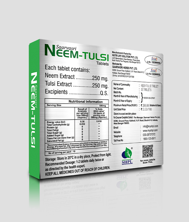 Saarvasri Herbs Neem-Tulsi Tablet is an anti-bacterial, Anti-viral and anti-fungal product to boost our immunity power. It is a perfect blend of nature’s two wonderful herbs Neem and Tulsi for protecting us from environmental hazards and toxinated pollutants to keep us healthy. By using this product we can lead a quality healthy life.