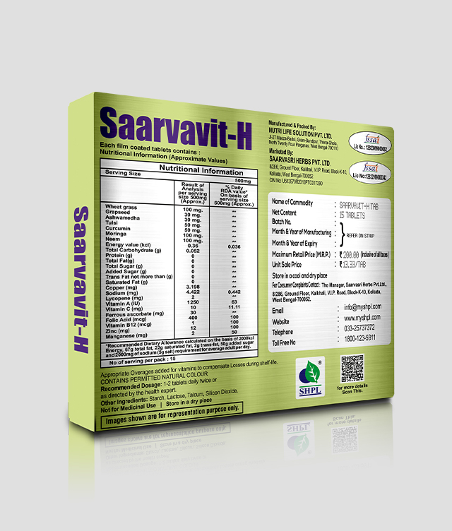 Saarvasri Herbs Saarvavit-H Tablet is a multi vitamin and multi mineral product to provide sufficient vitamins and minerals to the body. It is enriched with many natural herbs to maintain our daily energy and vitality. It is a supportive product for our general health and can be used to everybody for a quality healthy life.
