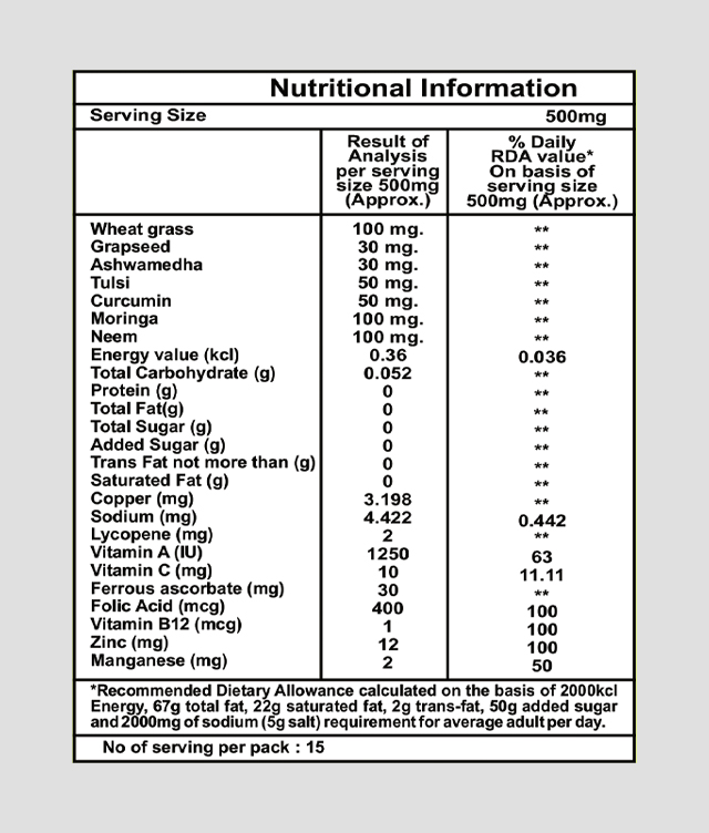 Wheat Grass, Grape Seed, Ashwagandha, Tulsi, Curcumin, Moringa, Neem.