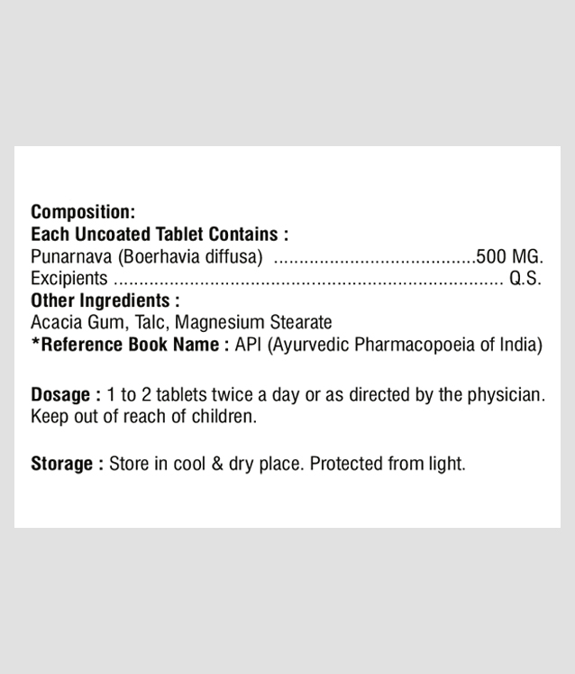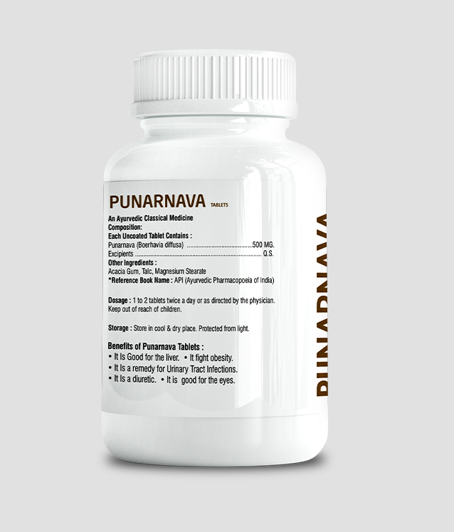 Punarnava which literally translates into ‘something that renews or replenishes the body ’is a traditional ayurvedic plant that is used to rejuvenate the whole body. Punarnava is a treasure trove of nutrients like proteins, vitamin C, sodium, calcium, iron and bioactive components like punarnavoside, serratagenic acid, hypoxanthine 9-L-arabinofuranoside, boeravinone A to F, liriodendron, ursolic acid, and oleanolic acid. Imbued with the therapeutic components, Saarvasri Punarnava Tablets hold high significance in promoting the digestive system, managing heart problems, improving eyesight and preventing diseases like diabetes, urinary tract infection, arthritis, impotence, gout, and anemia. It is also used in the treatment of rheumatoid arthritis, fever, edema, stomach issues, and liver disorders.
