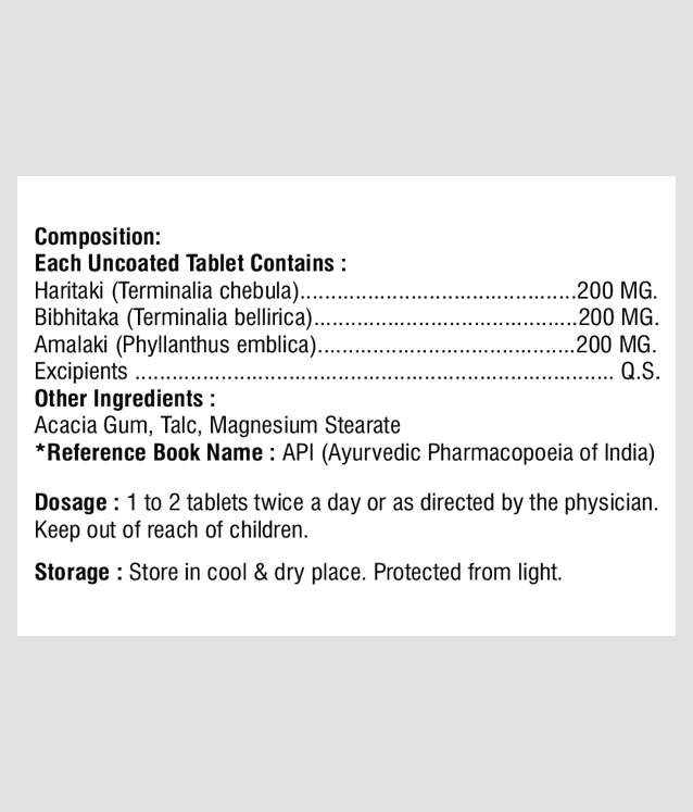 This ancient ayurvedic formulation consists of three medicinal fruits that are Amalaki (Phyllanthus Emblica), Bahera (Terminalia Bellirica), and Haritaki (Terminalia Chebula). This contains a rich source of vitamin c along with many important nutrients to the body. It is very helpful in digestion and weight loss, Regulating blood sugar levels, Reducing inflammation, Preventing cancer, Lower cholesterol, Normalize blood pressure, Inhibit HIV, Reduce tumors, Protect and improve liver function, promotes healthy hair and skin.