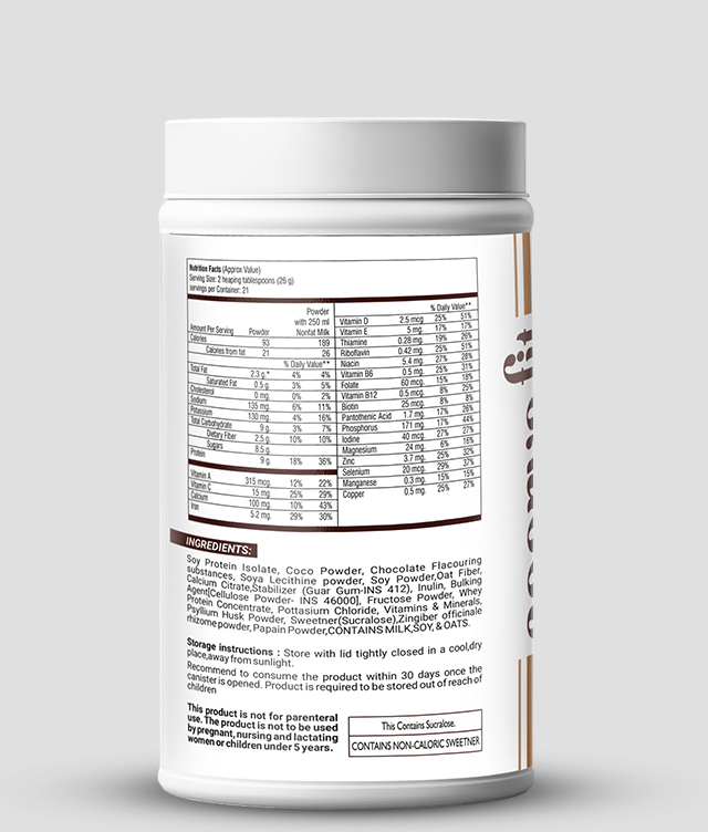 Soy Protein Isolate, Coco Powder, Chocolate Flacouring Substances, Lecithine Powder, Soy Powder, Oat Fiber, Calcium Citrate, Fructose Powder, Whey Protein Concentrate, Potassium Chloride, Vitamins, Minerals, Zingiber Officinale Rhizome Powder, Papain Powder