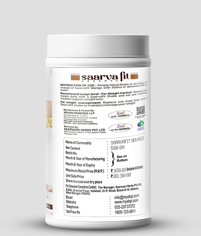 Saarvasri Herbs Saarva-fit Shake is a perfect solution for managing excessive body weight. It works as a meal replacement to reduce your calorie intake and helps you manage weight. It improves your digestion and reduces the accumulation of fats in the body.