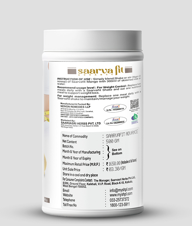 Saarvasri Herbs Saarva-fit Shake is a perfect solution for managing excessive body weight. It works as a meal replacement to reduce your calorie intake and helps you manage weight. It improves your digestion and reduces the accumulation of fats in the body.