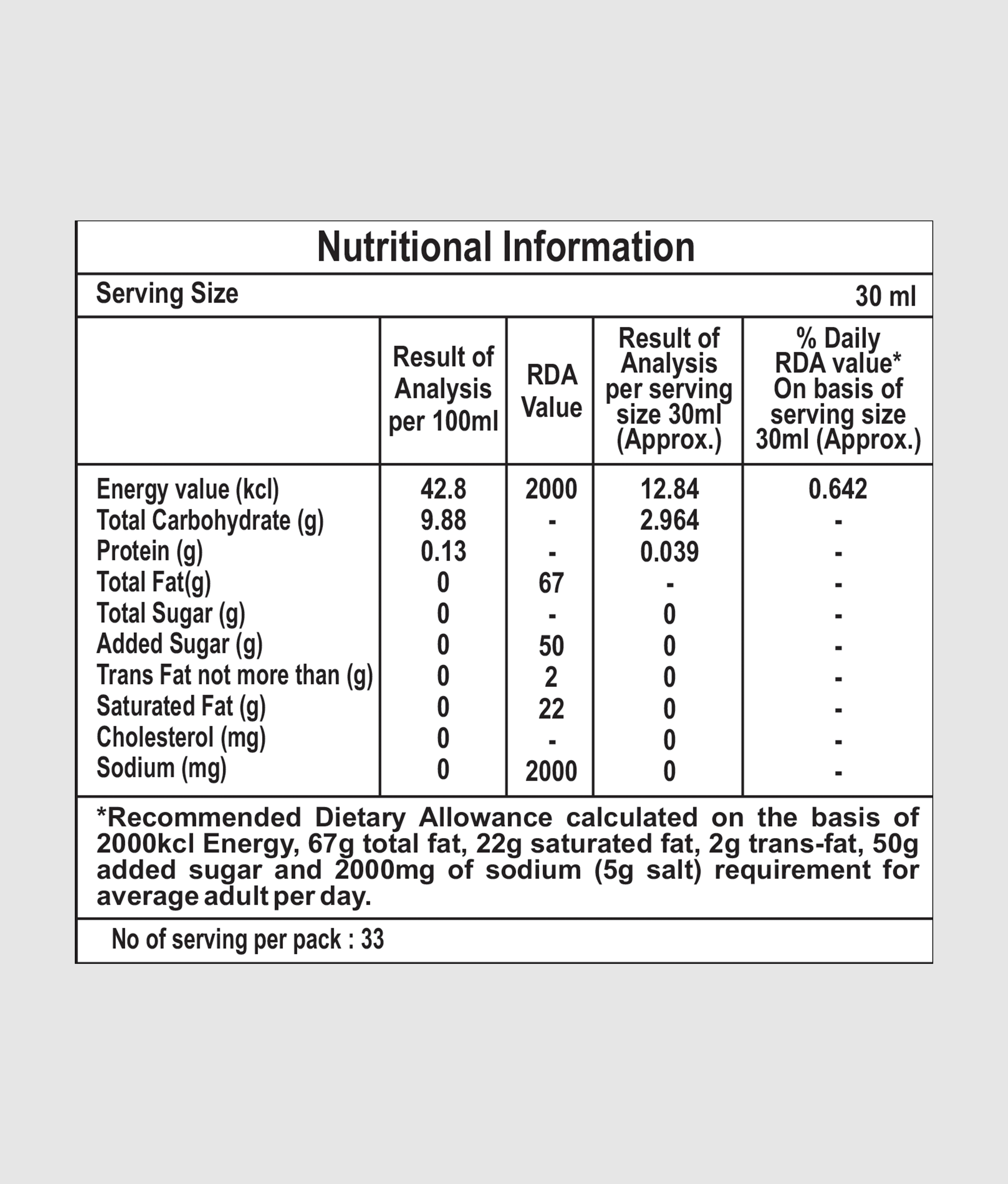 Lemongrass, Harad (Terminalia chebula), Baheda (Terminalia bellerica), Amla (Emblica officinalis), Sanay (Cassia angustifolia), Punarneva (Boerhavia diffusa), Pudina (Mentha arvensis), Aloe Vera (Aloe barbadensis), Jeera (Cumin)
