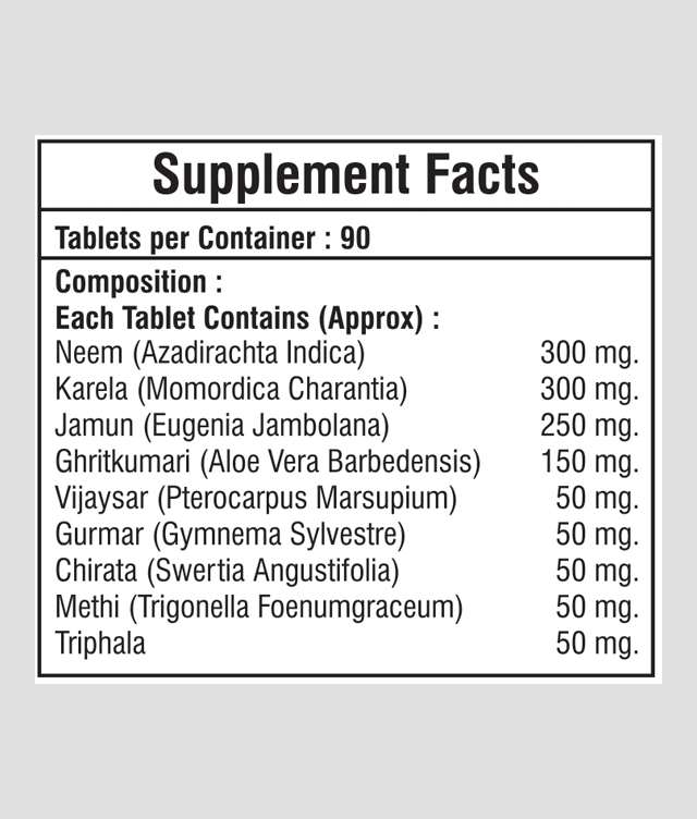 Neem, Karela, Jamun, Aloevera, Vijaysar, Gurmar, Chiraita, Methi, Triphala.